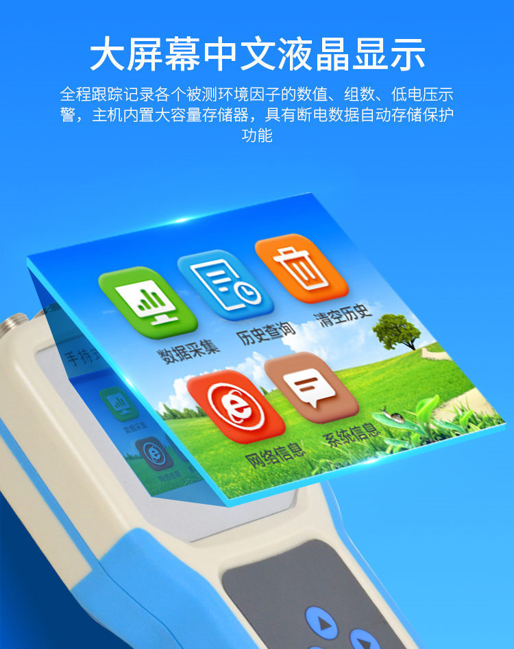 大屏幕中文液晶顯示,全程跟蹤記錄各個(gè)被測環(huán)境因子的數(shù)值、組數(shù)、低電壓示警,主機(jī)內(nèi)置大容量存儲器,可儲存三十萬條數(shù)據(jù),具有斷電數(shù)據(jù)自動(dòng)存儲保護(hù)功能。